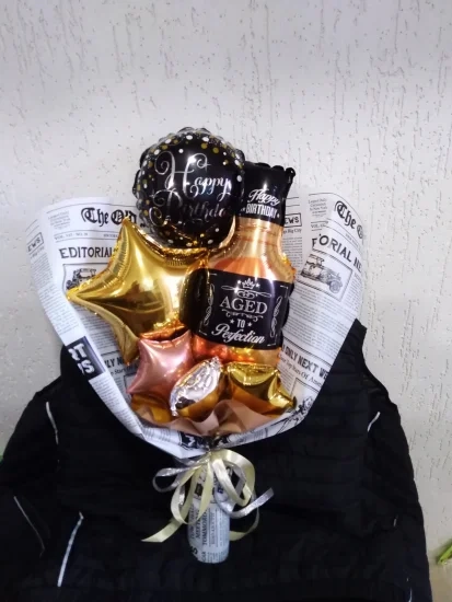 Букет з повітряних кульок Happy birthday виски золото буде чудовим подарунком. Такий букет не втратить свій вигляд навіть через 6 місяців. Ще одна перевага таких букетів це їхня ціна, яка значно дешевше за квіти. Букети розробляються за різними тематиками та приводами. Можливо виготовлення букета під замовлення.